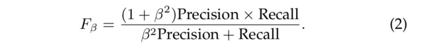 β2值经经验确定为0.3 [30],主要侧重于精确度的提升。一些方法直接采用图中最大Fβ值作为评估指标,而另一些方法则采用自适应阈值设定为[30],即以预测显著图平均值的两倍作为阈值设定,从而生成二元显著性映射,并计算相应的平均F值。