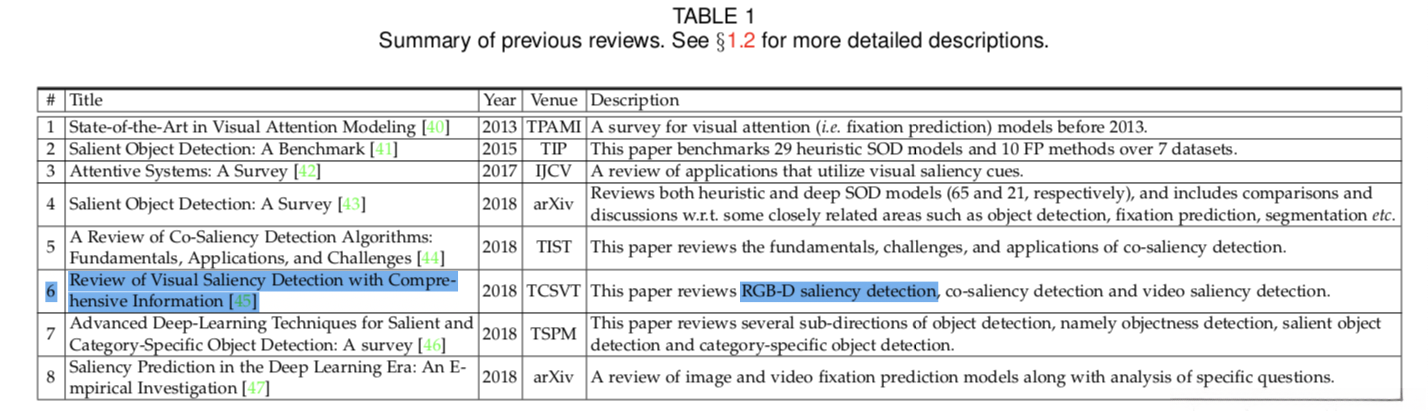 下表是对之前的一些关于显著性检测综述代表性论文总结: