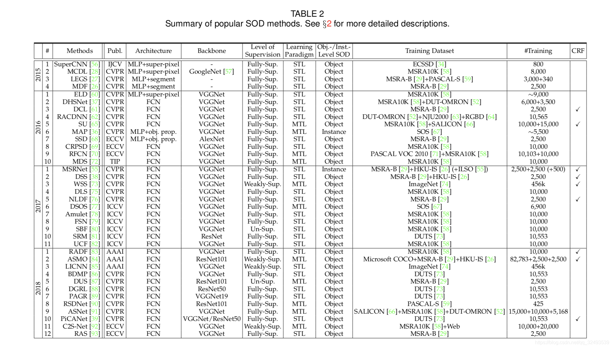 我们对深度SOD算法分为四个分类来进行回顾,表2提供了综合摘要。