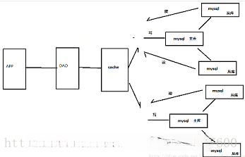 但是当数据再次增加到一个量级,上面的方式也不能满足需求,由于数据库的写入压力增大,Memcached只能缓解数据库的读取压力。读写集中在一个数据库上让数据库不堪重负,大部分网站开始使用主从复制技术来达到读写分离,以提高读写性能和读库的可扩展性。然后形成了: