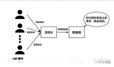 如下图所示,在大并发的情况下,所有的请求直接访问数据库,数据库会出现连接异常。这个时候,就需要使用redis做一个缓冲操作,让请求先访问到redis,而不是直接访问数据库。