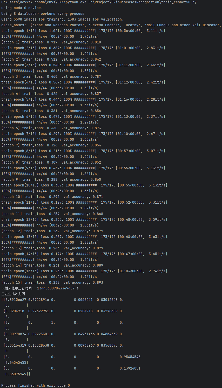 Tipps:探讨VGG16与ResNet50在皮肤病分类任务中的实验效果表现。涉及训练阶段的损失函数值及模型准确率曲线的变化情况,并对两者的模型性能进行对比分析;通过混淆矩阵(热力图)进一步分析分类性能及其分布特点;针对过拟合与欠拟合问题展开讨论,并从计算效率的角度进行评估