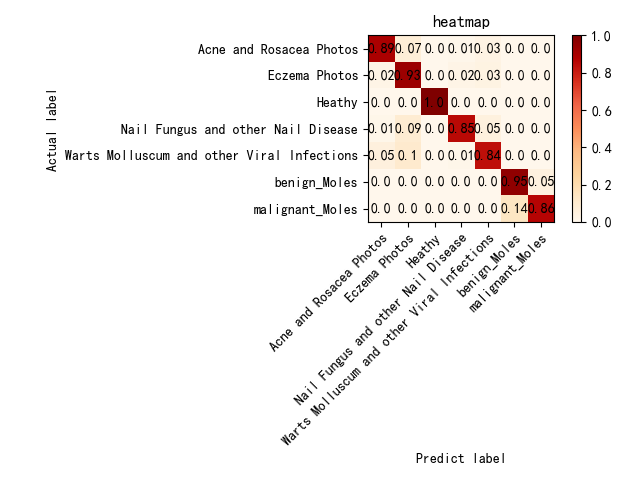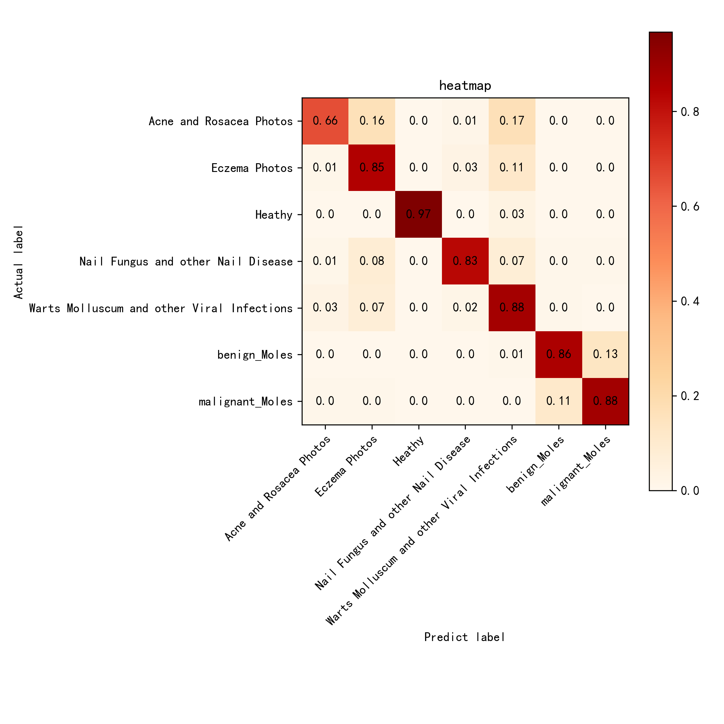 (1)优点:ResNet50模型在大多数类别上的表现相对较好,尤其在湿疹(Eczema Photos)、良性痣(Benign Moles)和恶性痣(Malignant Moles)上有非常高的准确率。