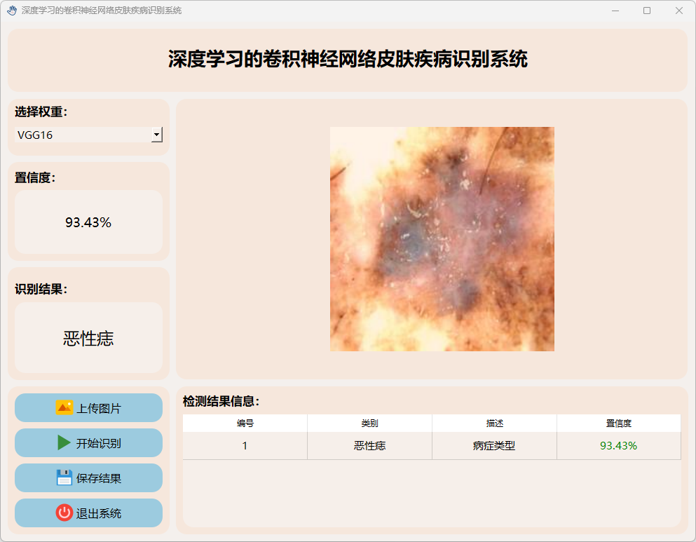 本研究构建了一个基于卷积神经网络的新型皮肤疾病识别平台,在临床医学领域具有重要应用价值。该平台通过深度学习算法对皮肤图像进行多维度分析,在此基础上实现了多种常见皮肤病的自动诊断与分类功能。研究者发现该系统凭借卷积神经网络卓越的特征提取能力,在处理海量皮肤样本时展现出极强的学习效能,并能有效识别各类复杂皮肤病变类型。为了进一步优化用户体验和技术性能,在开发阶段我们采用了PyQt5框架构建人机交互界面,并在此基础上设计了智能辅助诊断功能模块。实验结果表明该系统不仅能够便捷地完成医学影像数据的导入与处理工作,还提供了一系列智能化诊断服务功能