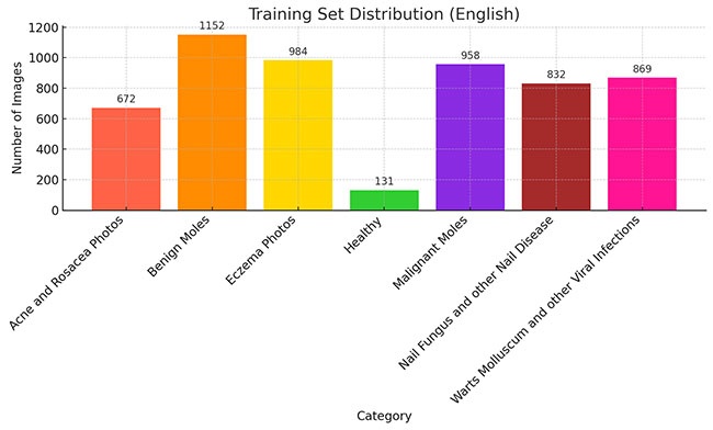 (2)测试集合计为1383张图像中包含痤疮和酒渣鼻 166张图,良性痣 286张 图,湿疹 244 张 图,健康皮肤 31 张 图,恶性痣 237 张 图,指甲真菌感染 206 张 图以及疣、软疣及其他类别的总计数为各分类中的最少数量即分别对应 Train 集中的各类别数量用于评估模型在未见数据上的表现