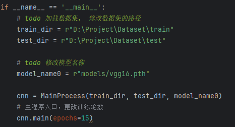 执行该脚本将从指定路径加载训练数据集和测试数据集,并创建并初始化一个MainProcess对象,并使用VGG16架构进行模型训练。该操作将设定模型的训练迭代次数为15次。