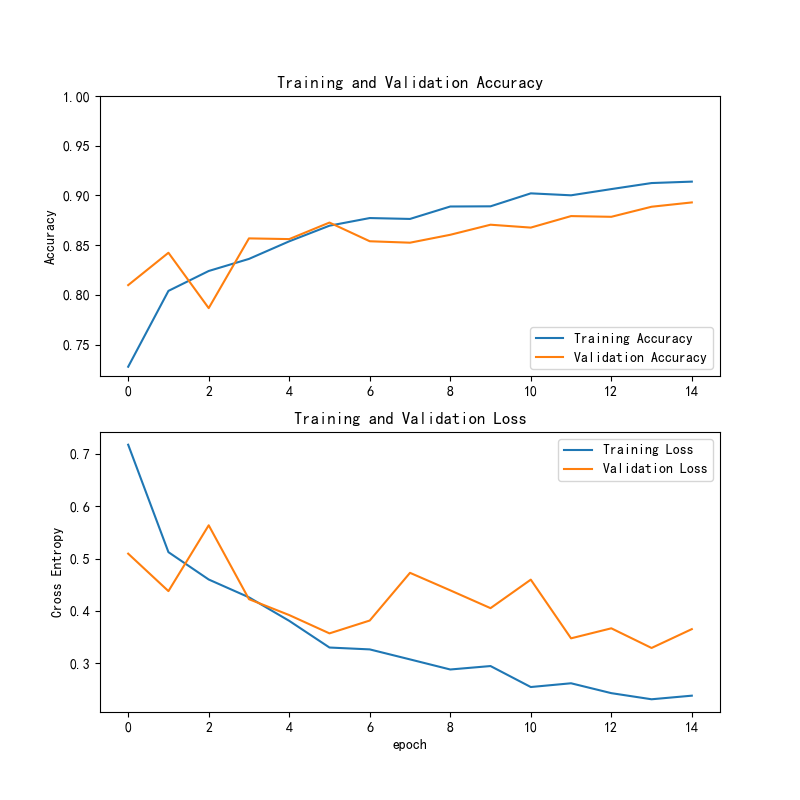 验证准确率从 epoch 0 的 0.810 增长至 epoch 15 的 0.893,并由此可观察到模型在验证集上展现出良好的性能表现及较强的泛化能力