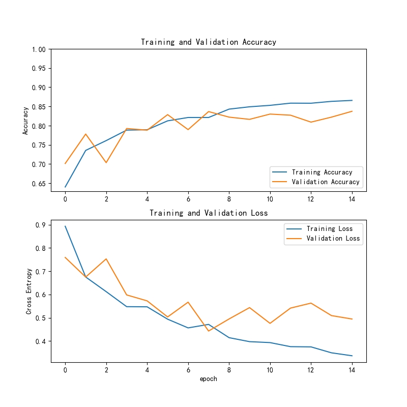 (1)在第6个到第12个 epoch期间内,在此阶段中训练损失持续下降,在此期间验证准确率稳步上升直至最终于第15个 epoch达到0.837的水平值表明训练过程已趋于收敛状态。