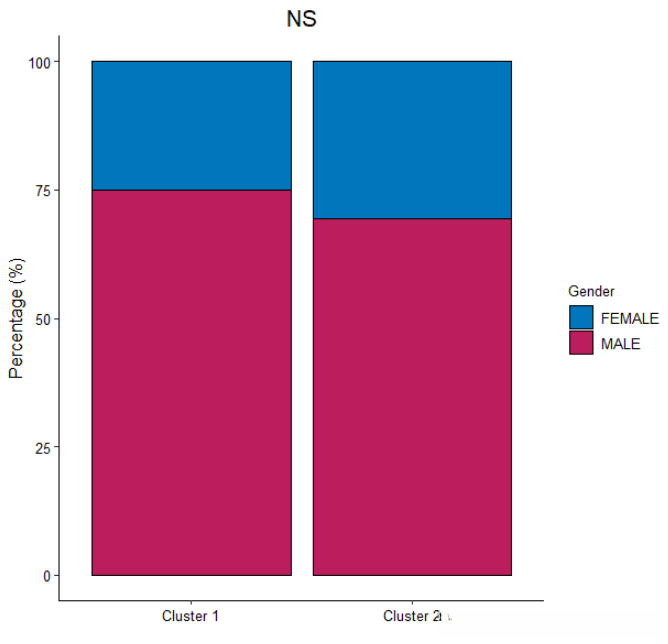 通过聚类分析的方法, 我们将样本划分为两个子集, 以研究性别在两个子集中的比例分布情况. 此时可以通过分组条形图来展示结果.