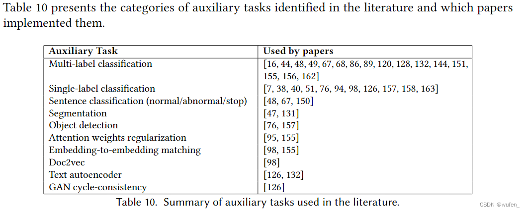 最常见的辅助任务是多标签(16 篇论文)和单标签(11 篇论文)分类。