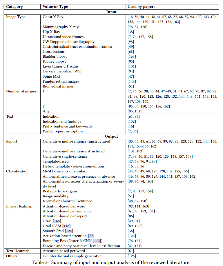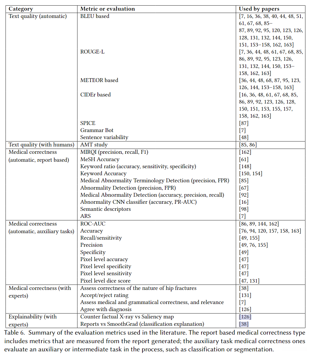 许多模型还输出补充的分类预测,例如是否存在异常或疾病、MeSH 概念、身体部位或器官等,许多模型还可以使用不同的技术在图像上输出热图,突出显示相关区域,例如在报告生成过程中计算的显式视觉注意力权重、显着图方法(例如CAM、Grad-CAM、SmoothGrad 或基于激活的注意力)、边界框回归和像素级分类(图像分割)。此外,一种模型 [61] 可以在其输入文本上输出热图,而一种模型 [126] 可以生成反事实示例来证明其决策的合理性。我们将在可解释性部分(5.3)中更详细地讨论所有这些输出及其用途。