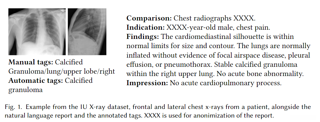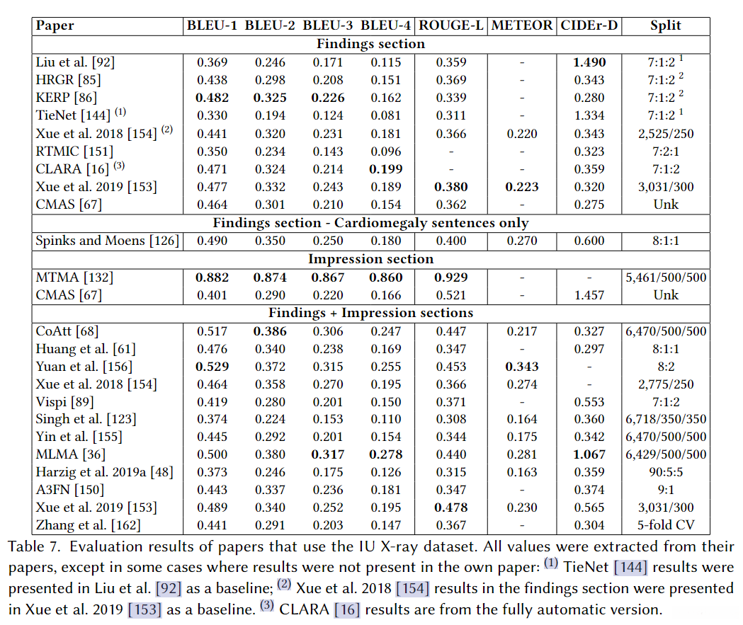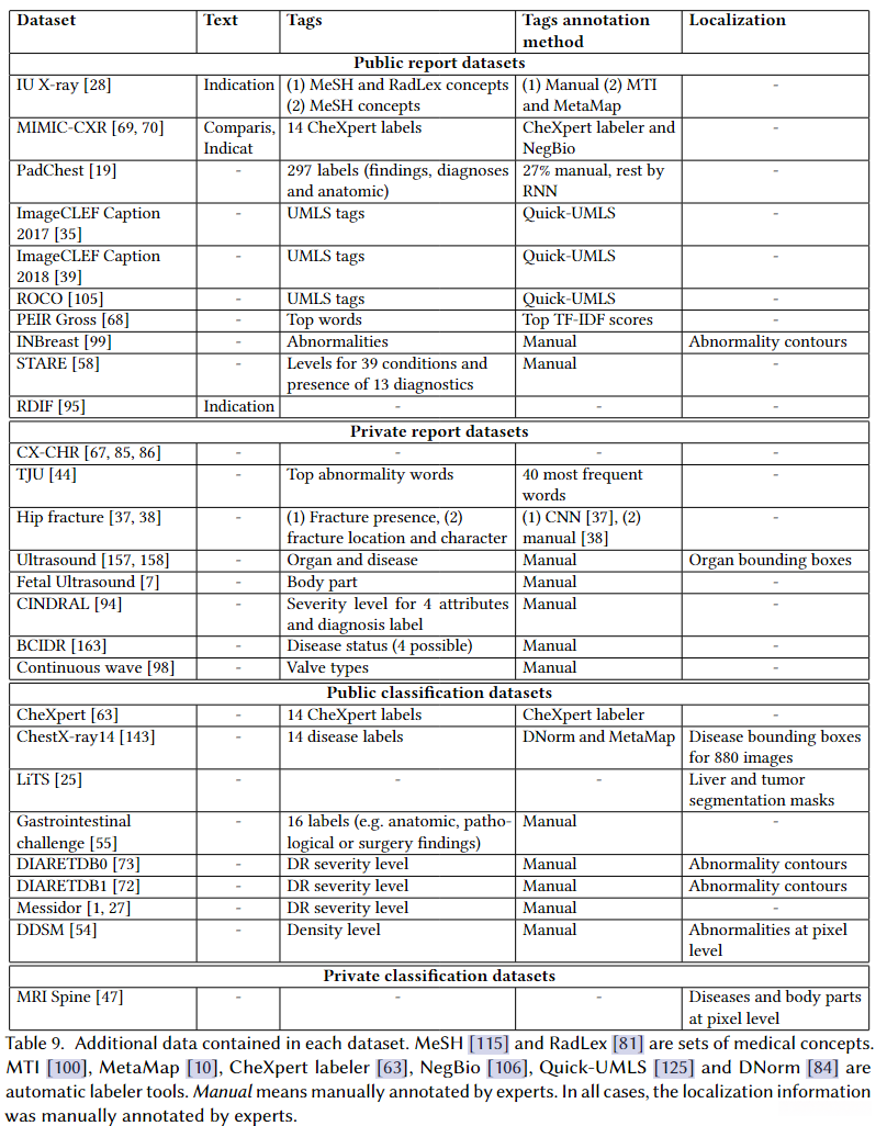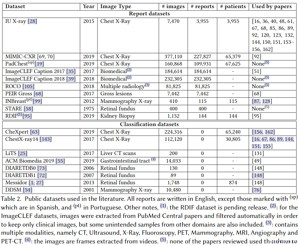 IU X-ray为最常用,由 7,470 个正面和侧面胸部 X 射线和 3,955 个报告组成。此外,每份报告均使用医学主题词 (MeSH) 和 RadLex 术语进行手动注释。并使用 MTI 系统加上 MetaMap的否定工具自动使用 MeSH 术语进行注释。但与IMAGENET这些一般数据集相比,数量较少,需要使用数据增强或者预训练来处理。最近的数据集MIMIC-CXR或 PadChest 可以部分解决这个问题,它们分别包含 377,110 和160,868 个图像,但尚未广泛使用。所有报告数据集都包含图像和报告,其中大多数还包含每个报告的标签。
