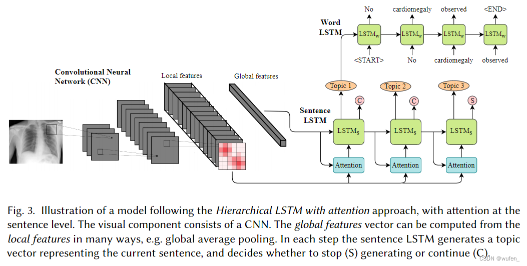 语言组件的工作是生成报告。最简单的方法是使用循环神经网络(例如 LSTM 或 GRU)逐字生成完整报告。所有这些工作的共同点是 GRU/LSTM 在开始时从视觉组件接收编码向量,并从中解码完整的报告。