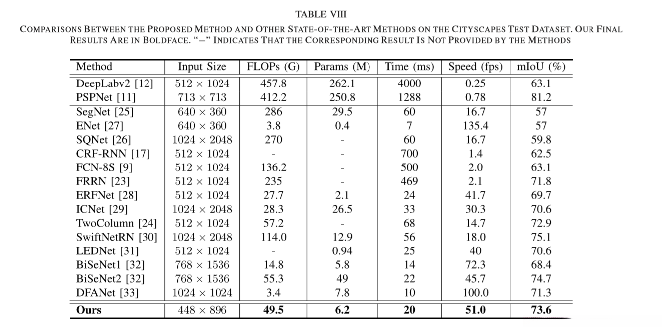 思考: 从实验结果来看,在实际应用中若采用高分辨率输入,则计算能力会显著提升。该网络架构及其几个精度提升模块具有一定的参考价值。然而需要注意的是,在当前设置下(如448×896像素),尽管其浮点运算性能(FLOPS)略高于当前主流模型如ERFNet、ICNet等,在实际应用中若采用更高分辨率输入,则计算能力会显著提升。另外值得注意的是,在当前设置下(如448×896像素),尽管其浮点运算性能(FLOPS)略高于当前主流模型如ERFNet、ICNet等,在实际应用中若采用更高分辨率输入,则计算能力会显著提升。另外需要注意的是