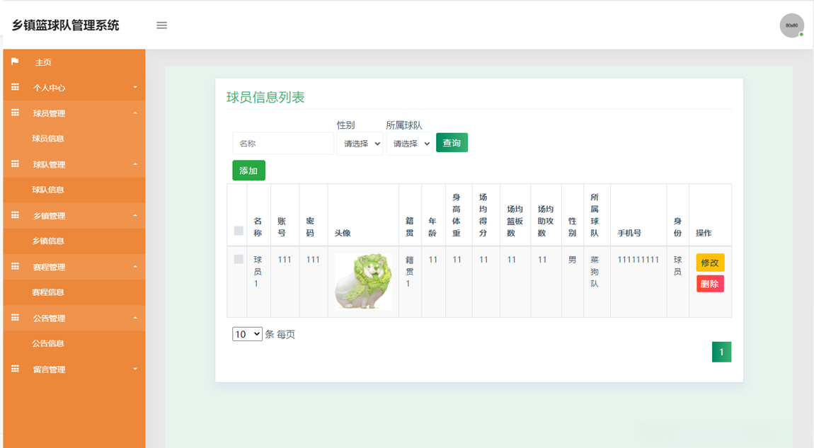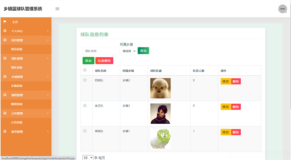 如图所示的是球队信息管理页面。此页面提供的功能包括:查看已发布并存储的球队数据记录、编辑支球队的信息资料、将对应球队的信息标记为无效状态以及删除该队的档案文件。