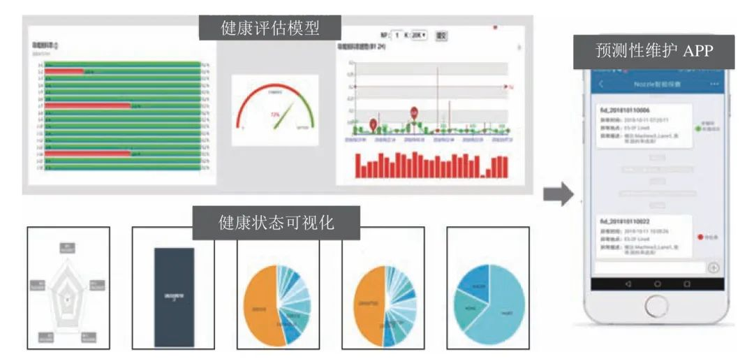 在收集有效数据后,分析技术(AT)方面通过机器学习等方法训练数据驱动模型,让设备能自动判断滤芯脏污区域,再通过改善吸嘴滤芯的洁净度,延长其使用寿命.此模型目前在富士康集团经历了多次优化及改善,使每一支吸嘴都有专属的独立健康模型,并植入所开发的APP 中,如图7 所示,可以及时反应吸嘴受堵的异常状态并警示维护人员,又能预测部件可用的剩余寿命.