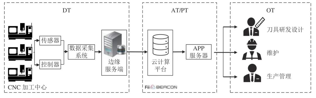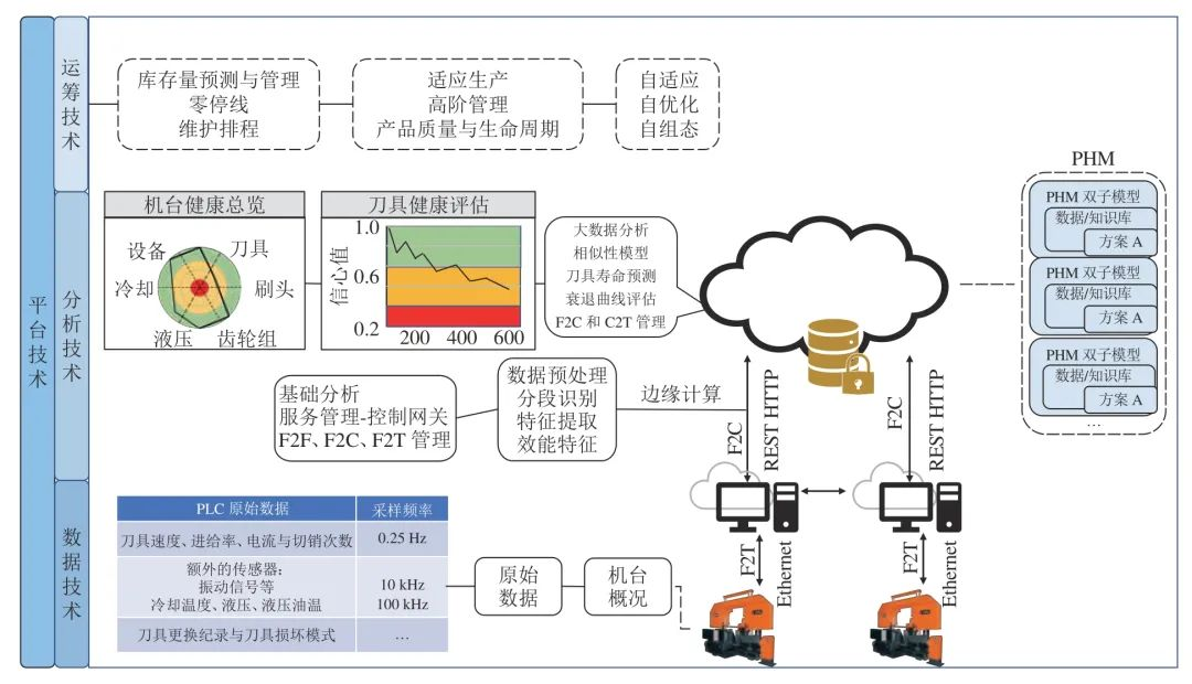 这个例子中,DT 对应的是适合的传感器安装,控制器通过工业级的通讯协议如MTconnect、Modbus 等来传递数据,而更先进的通讯技术如4G 网络被用来解析来自雾层的数据;AT 创造一个流程来转换数据,让先进的机器学习模型如卷积神经网络可以用来评估刀具的健康状况或是预测刀具的剩余寿命,刀具和其他部件的健康状况通过可视化来呈现,相关的结果可从行动装置和网络服务得知.最后基于分析结果,操作人员来决定是否对该机台进行维护、更换刀具和其他零部件等.