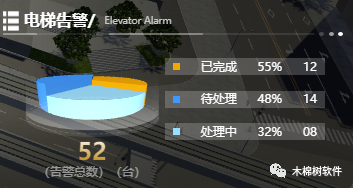 mms3D通过整合电梯管理子系统,运用2D图表呈现电梯维修、保养等相关数据信息。通过饼图直观展示电梯的历史告警数据,并根据不同的处理状态进行分类。运管人员能够清晰掌握通过数据进行查询和分析,实现快速决策和整体管理。