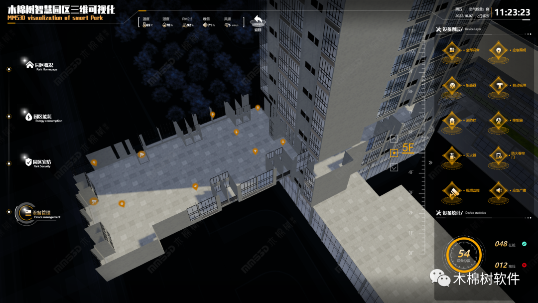 mms3D系统通过各设备子系统的接入,将包括烟杆、消防栓、灭火器、视频监控设备、照明设施、喷淋系统、排烟扇、卷帘门以及广播设备等,借助CAD和施工图纸将各点位标注到三维场景中。系统操作界面右侧的设备功能清单,支持全部设备或灵活筛选部分设备类型,实现园区运行管理的统一监控界面“一屏通览”。