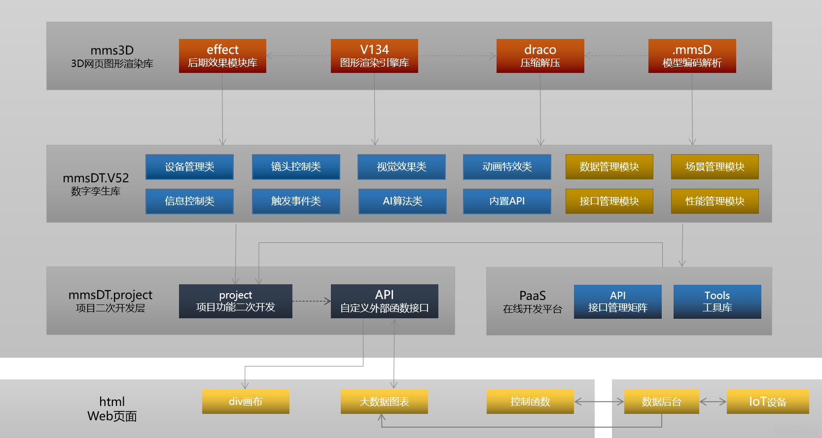 该系统以mms3D图形引擎和mmsDT-5.0可视化开发平台为基础,采用基于WebGL标准的B/S架构,支持便捷的web网页访问。
