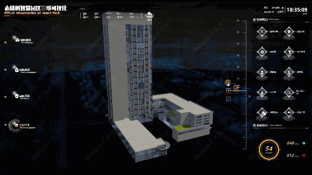 通过操作可视化系统的功能模块,实现设备管理页面的切换。mms3D引擎的渲染性能实现了园区大楼的透明化展示,以写实风格突出当前楼幢的主要特征。通过楼层标识卡尺的功能,实现不同楼层的切换展示,抽屉拉出的方式实时呈现楼层内的设备布局点位。