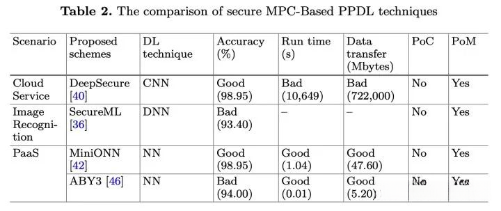 下表总结了每种基于MPC的方法的比较。准确率是指PPDL模型预测的正确率。运行时间是模型进行加密、将数据从客户端发送到服务器、进行分类处理所需的时间。数据传输(通信量)是从客户端传输到服务器的数据量。PoC意味着服务器或任何其他方都不知道客户端数据。PoM意味着客户端或任何其他方都不知道服务器中的模型分类器。