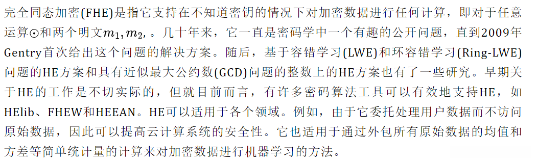 1978年,Rivest et al.质疑是否存在任何加密方案来支持在不知道秘密信息的情况下对加密数据进行计算。例如,教科书上的RSA加密支持在没有私钥的情况下对加密数据进行乘法运算,我们称之为乘法同态加密(HE)。同样,如果一个系统支持在没有密钥的情况下对加密数据进行加法运算,我们称之为加法同态加密。