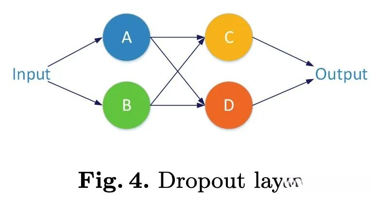 如图4所示,丢弃层(Dropout layer)是为解决过拟合问题而创建的层。有时,当我们训练机器学习模型时,对于某些数据分类结果会太好,表现出对训练集的偏向。这种情况并不好,导致测试周期出现巨大误差。丢弃层在训练过程中会丢弃随机数据,并将数据设置为零。通过在训练期间反复这样做,我们可以防止在训练阶段过拟合。