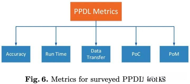 为了比较每篇调查论文的性能,我们使用了准确率、运行时间、数据传输、客户端隐私(PoC)和模型隐私(PoM)等五个指标。图6显示了本文中调查的PPDL的度量标准。准确率是指PPDL模型预测的正确率。运行时间是模型进行加密、将数据从客户端发送到服务器、进行分类处理所需的时间。数据传输(通信量)是从客户端传输到服务器的数据量。PoC意味着服务器或任何其他方都不知道客户端数据。PoM意味着客户端或任何其他方都不知道服务器中的模型分类器。我们测量了每种方法的准确率、运行时间和数据传输的平均值。然后,我们将平均值作为标准。如果精度值高于平均值,则表明该方法的精度较好。此外,如果运行时间和数据传输量低于平均值,则表明该方法的运行时间和数据传输量较好。我们采用各自论文中的比较数据,因为我们认为这是可能达到的最好结果。我们不会重新执行他们的代码,因为并不是所有的代码都是公开的。本文的重点是将经典隐私保护与各种深度学习实践相结合的混合PPDL方法。