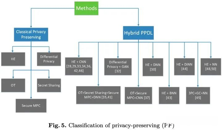 在这一部分中,我们将讨论当前PPDL技术的发展现状,将PPDL方法分为三类:基于HE的PPDL、基于MPC的PPDL和基于差分隐私的PPDL。图5显示了据我们所知隐私保护方法的分类。方法分为经典PPDL和混合PPDL。经典隐私保护方法不包含任何深度学习技术,而混合PPDL是经典隐私保护方法与深度学习的结合。由于传统的隐私保护技术已经过时,本文主要研究混合PPDL技术。