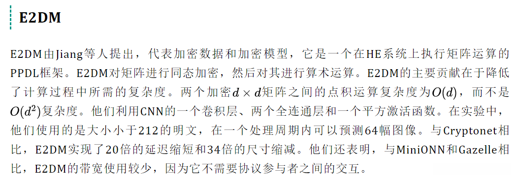 Hesamifard等人提出的CryptoDL是一种改进的用于加密数据的CNN。他们以低阶多项式改变了CNN的激活功能部分。本文证明了多项式逼近在HE环境下对于神经网络来说是不可缺少的。他们试图近似三种类型的激活函数: ReLU、Sigmoid和tanh。逼近技术是基于激活函数的导数。首先,在训练阶段使用具有多项式逼近的CNN,然后利用训练阶段产生的模型对加密数据进行分类。作者将该方法应用于MNIST数据集,取得了99.52%的准确率。该方案的缺点是没有覆盖深度神经网络中的隐私保护训练。他们仅将隐私保护用于分类过程。与Rouhani等人不同的是,这项工作的优点是它可以为每一轮预测划分许多实例(8192个或更多)。也就是说,与DeepSecure相比,CryptoDL的工作效率更高。