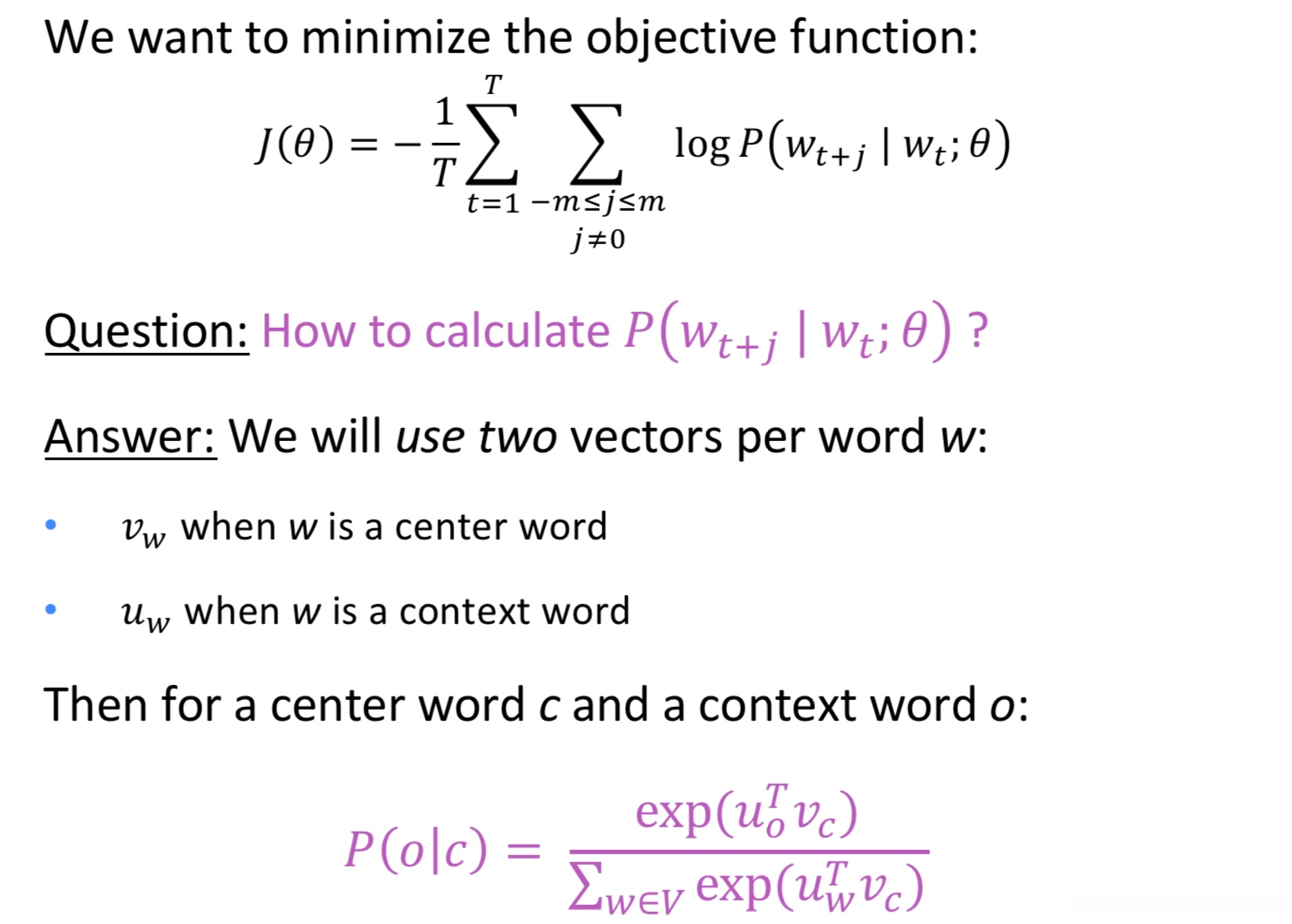 利用中心词c和其上下文词o的向量相似度来计算给定c时o的概率(反之亦然)。