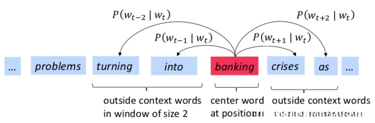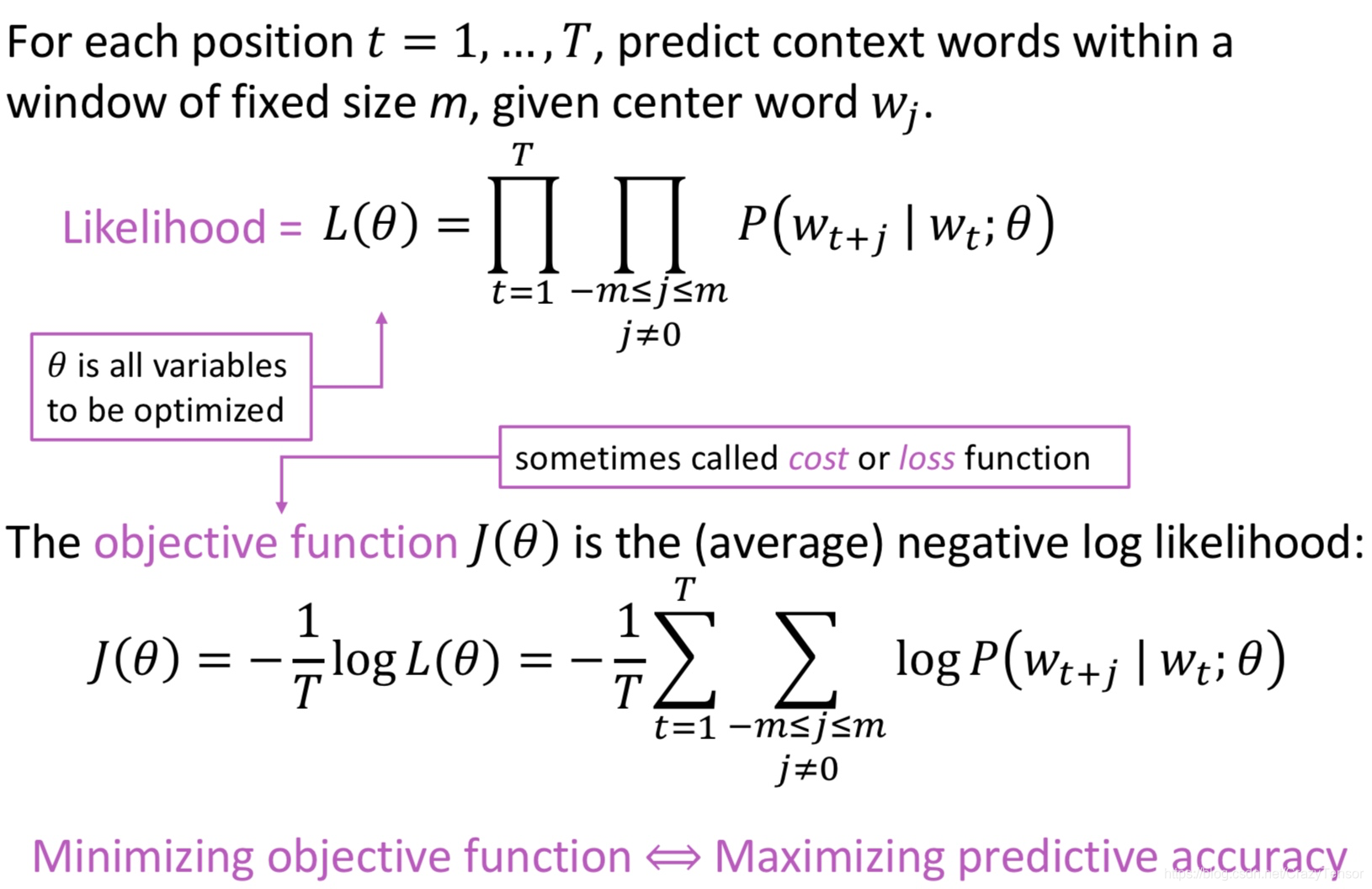 遍历文本中的每个位置t,其中心词是c,而o是其周围的上下文词。