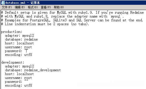 把 C:\Sites\redmine-2.5.2\config目录下的 database.yml.example 原地拷贝一份,名字改为 database.yml ,然后用文本编辑器打开它,数据库连接就在 database.yml 中配置。