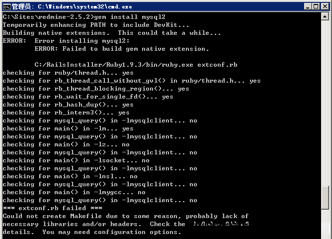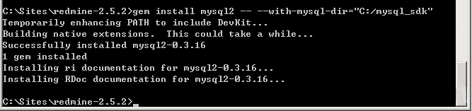 Redmine 需要 mysql2(MySQL 针对 Ruby 的 C binding )据说可以提高性能,你可以在 Ruby and Rails 的命令行环境中执行下面的命令来安装: