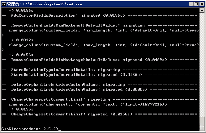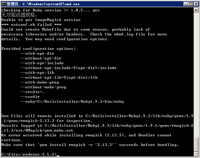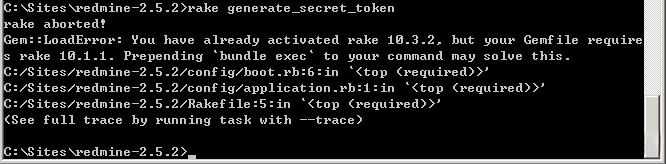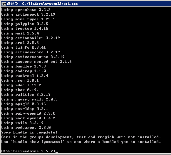 然后要确认你在 C:\Sites\redmine-2.5.2 目录下面,不在的话,使用 cd 命令进去,然后执行下面的命令来解决 redmine 需要的依赖:
