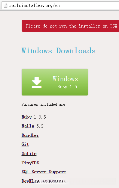 网站在这里:RailsInstaller 。按下图所示,选择 Windows 下的安装包来下载: