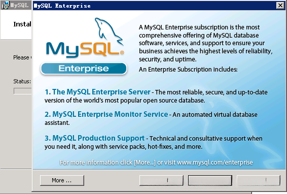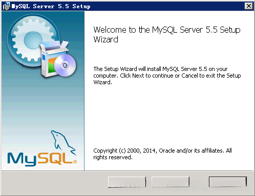 你可以随便选择某个版本,大于 5 即可。我使用 5.5.40 x86 32bit MSI installer ,下载了 mysql-5.5.40-win32.msi 。下面是安装欢迎界面: