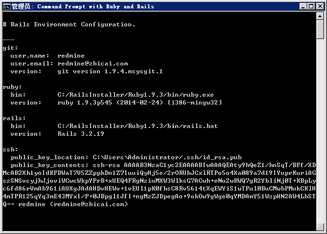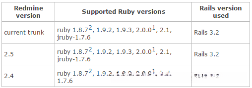 Redmine 2.5 版本需要 3.2 及以上版本的 Rails ,支持1.8.7 、 1.9.2 、 1.9.3 、2.0.0, 、 2.1 等版本的 Ruby 。后面我选择 RailsInstaller-2.2.4 来安装 Ruby 和 Rails ,它里面包含的 Rails 版本是 3.2.19 , Ruby 版本是 1.9.3p545 ,符合 Redmine 的要求。