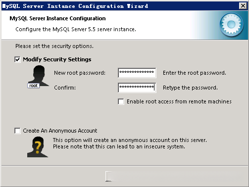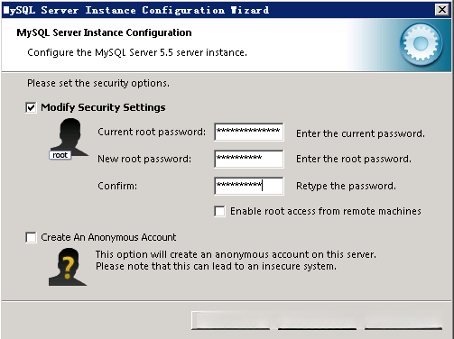 我只好叫来我的同事,询问之前的 MySQL 密码……然后呢, Skip 了。回到 bin 目录,找到 MySQLInstanceConfig 来运行,保持刚才那一路辛苦的配置,到了修改账号这里了,如下图: