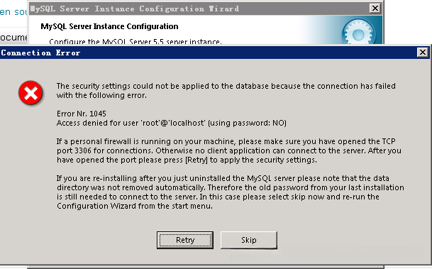 我觉得可能是防火墙吧,因为同事说 MySQL 已经删除了。于是我把 mysqld 、 mysql 等等都加入到例外中,然后又到入站规则那里设置了 3306 端口的规则,费了半天劲,最后回来 Retry ,嘿嘿,又弹这个!