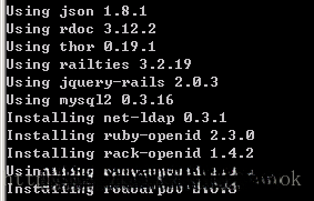 这里又会尝试安装 mysql2 ,因为我们在 production 中指定使用 mysql2 作为数据库适配器。如果发现已经安装,就直接用本地的。你会看到 Using xxx 之类的信息,如下图: