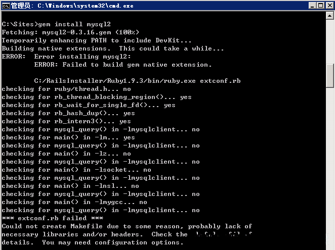 再次执行 gem install mysql2 ,又错啦……