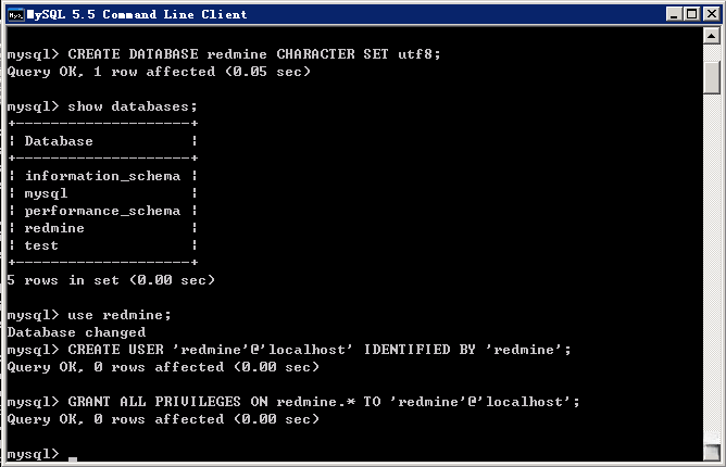 基本步骤是酱紫的:从开始菜单执行 MySQL 5.5 Comand Line Client ,输入密码,登录成功,创建库 redmine ,创建用户 redmine ,授权其访问 redmine 库。