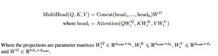 与使用dmodel维的键、值和查询执行单个注意力函数不同,发现将查询、键和值分别以不同的、学习过的线性投影h次线性投影到dk、dk和dv维是有益的。在这些查询、键和值的每个投影版本上,并行地执行注意力函数,产生dv维输出值。将这些进行拼接并再次投影,得到最终的值。