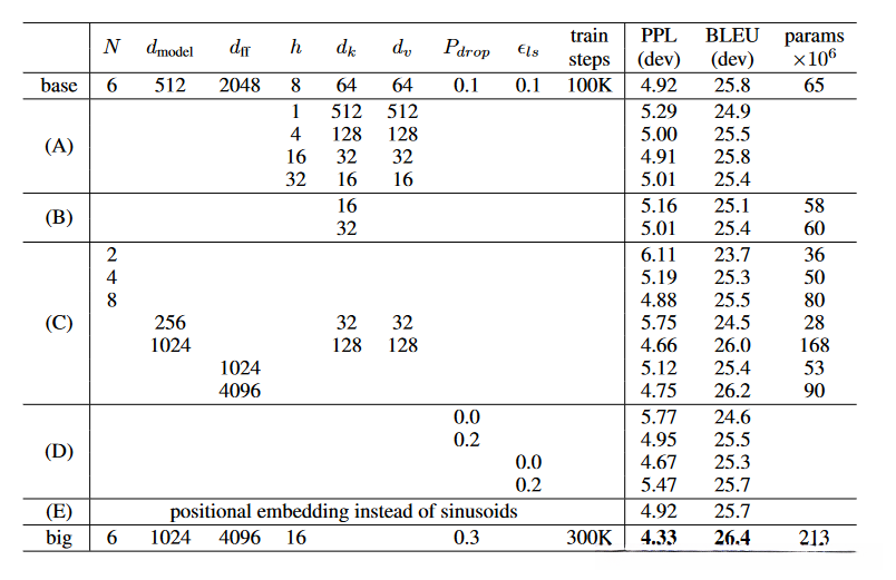 在表行(B)中,发现减小关注键大小 dk 会降低模型质量。这表明,确定兼容性并不容易,比点积更复杂的兼容性函数可能更有益处。在第(C)行和第(D)行中,进一步观察到,正如所预期的那样,模型越大越好,而 dropout 对避免过度拟合很有帮助。在第(E)行中,用学习到的位置嵌入[9]替换了正弦位置编码,观察到的结果与基础模型几乎完全相同。