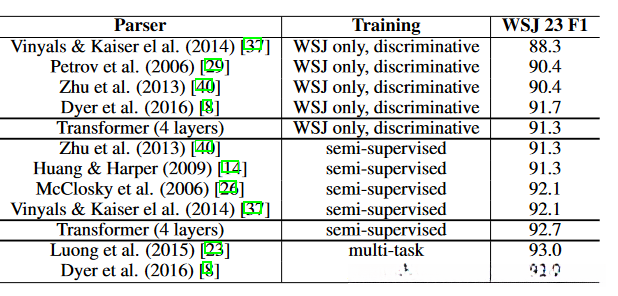 与 RNN 序列到序列模型相比,即使只在由 40K 个句子组成的 WSJ 训练集上进行训练,Transformer 的表现也优于 BerkeleyParser。