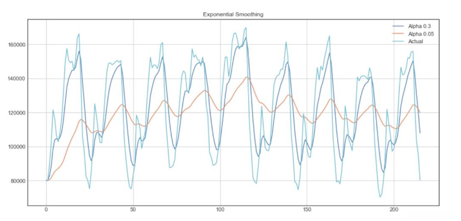 From the above plot, the dark blue line represents the exponential smoothing of the time series using a smoothing factor of 0.3, and the orange line uses a smoothing factor of 0.05. As we can see, the smaller the smoothing factor, the smoother the time series will be. Because as smoothing factor approaches 0, we approach to the moving average model