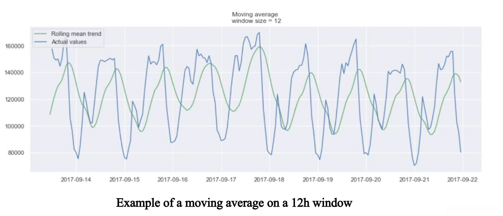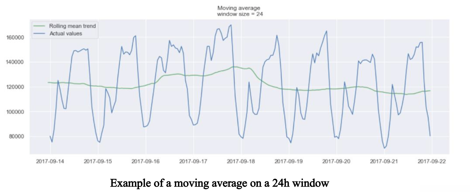 In the plot above, we applied the moving average model to a 24h window. The green line smoothed the time series, and we can see that there are two peaks in the 24h period. The longer the window, the smoother the trend will be.
