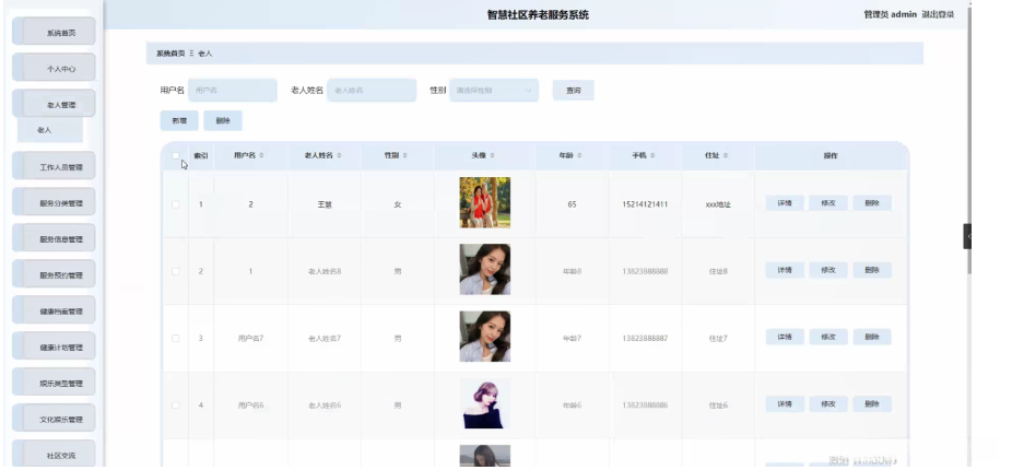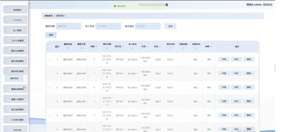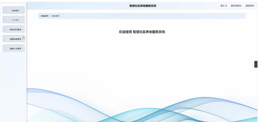 后端管理系统设计较为完善,并支持老年人使用。通过点击后端管理系统功能模块...完成相应的操作。老年人可以通过该系统实现个人中心服务预约健康档案 etc. 如图5-5所示